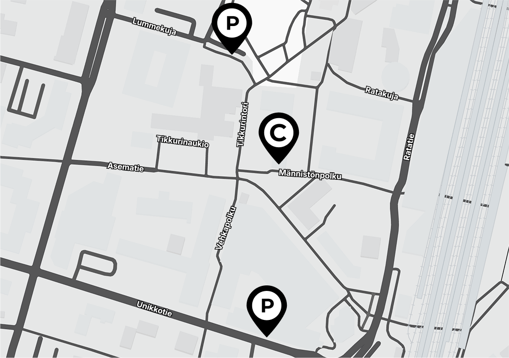 Tikkurilan keskustassa on parhaillaan käynnissä ratikan rakennustyöt, joten pysäköintijärjestelyt poikkeavat totutusta. Suosittelemme saapumaan Tikkuparkin kautta: aja Kielotieltä Lummekujalle ja alas parkkihalliin. Sieltä pääset suoraan hissillä Tikkurilan aukiolle ja kävelymatka liikkeeseemme on lyhyt. Pysäköinnin voit maksaa ParkMan- tai EasyPark-sovelluksella.